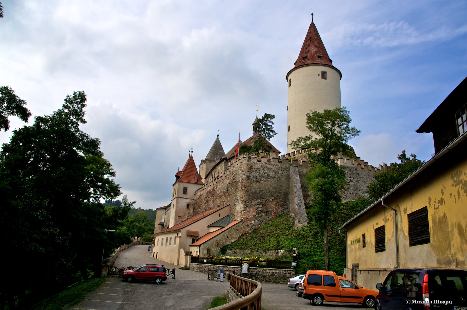 Замок расположен в 40 км от столицы. Потемневшие наружные стены и черепичные крыши старинной постройки поднимаются над холмом. Над ними высится белоснежная круглая башня Гудерка, укрытая коническим куполом. Высота её составляет 42 м; толщина наружных стен – 9 м. О происхождении необычного названия башни слагались легенды. В XVI–XVII вв. она была тюрьмой – тогда в нижней части строения помещалась камера пыток. Узников пытали так, что в противоположной башне «Гудерка» вынуждены были играть музыку (по-чешски – hudba «гудба»), чтобы заглушить крики истязаемых. Сегодня в башне содержится коллекция охотничьего снаряжения и трофеев.
