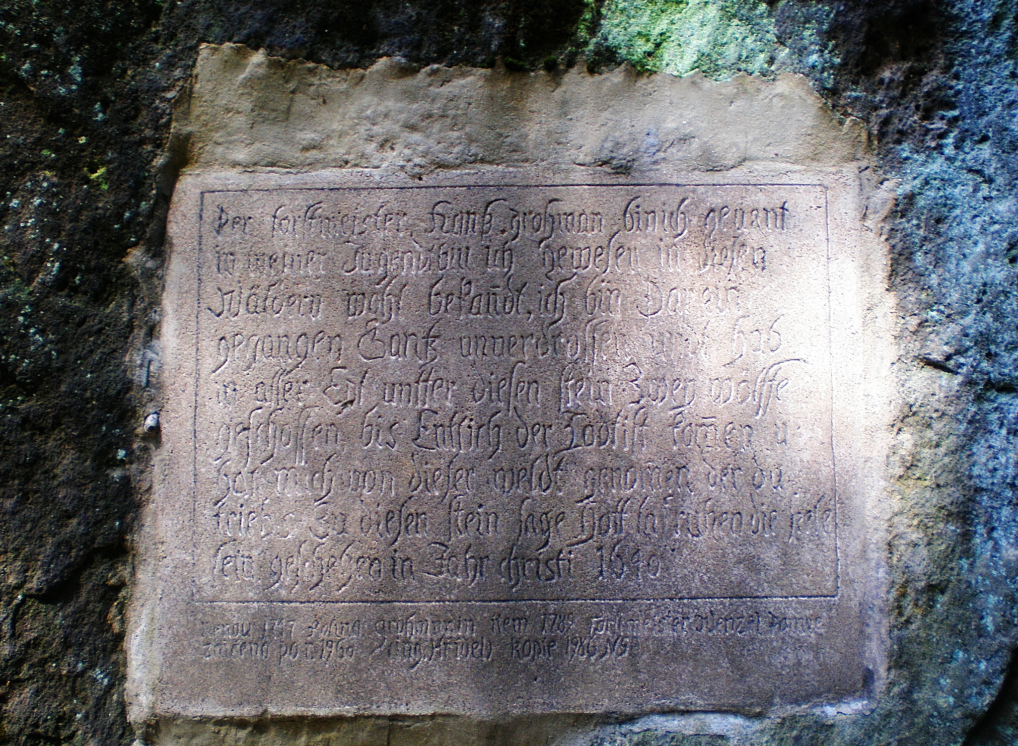 В XVII веке неизвестный лесник потратил массу времени, чтобы увековечить день и час, когда он убил двух волков. Камень прикрыла выросшая здесь ель. Но однажды, после бури, дерево упало, и вновь показались загадочные надписи.